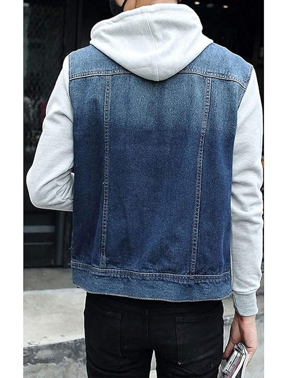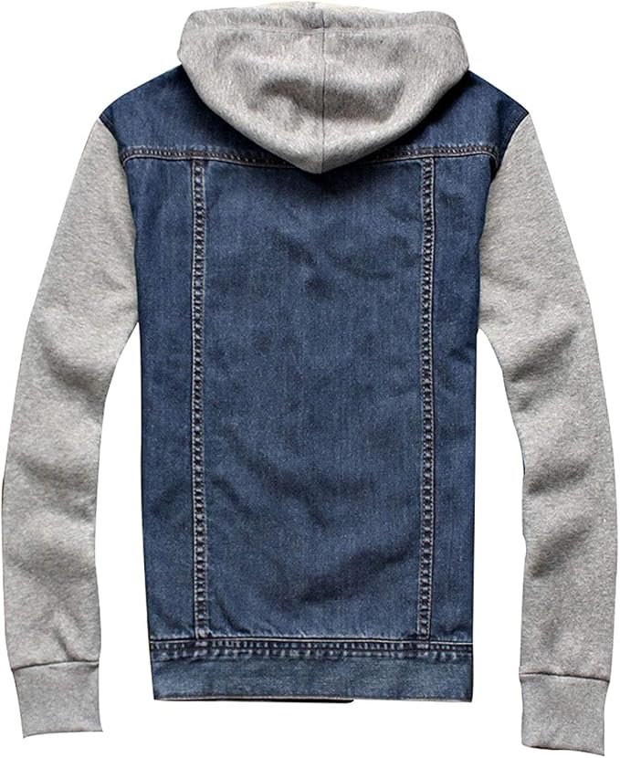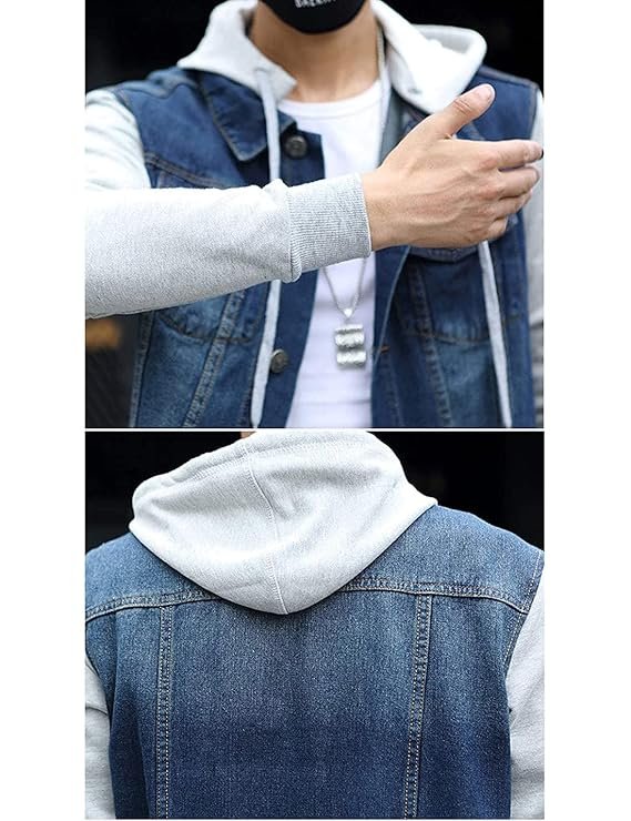 - Casual classic detachable hooded denim cowboy jacket coat for men, suit for work travel home or daily wears. You can wear with fleece sweatpants, ASIN: B08D3FJ66L